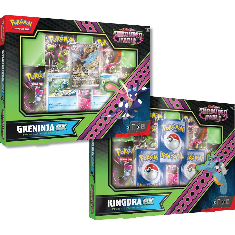 Pokémon Scarlet & Violet: Shrouded Fable Kingdra or Greninja ex Special Illustration CollectionAdorn your collection with artistic flair in this special collection! Inside is a special illustration rare-style promo card featuring one of two Pokémon ex, plus foil cards of their Evolution chain. And with the included Pokémon TCG booster packs, you are sure to find even more awesome Pokémon for your next battle! . |