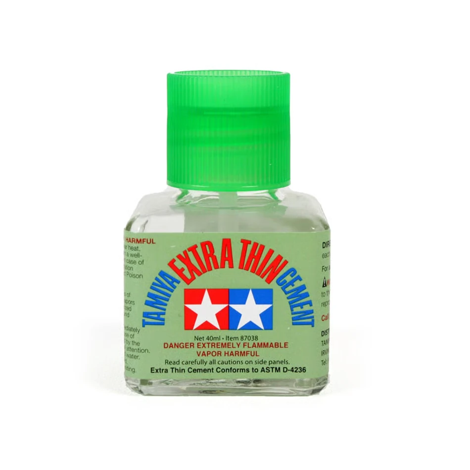 Liquid type plastic cement that is designed to work with plastic models and other similar plastic materials found in model making. This EXTRA THIN formula cement is used to glue together plastic model kits that use polystyrene plastic. The extra thin formula allows the modeler to glue together small pieces that require pin point accuracy and finesse.