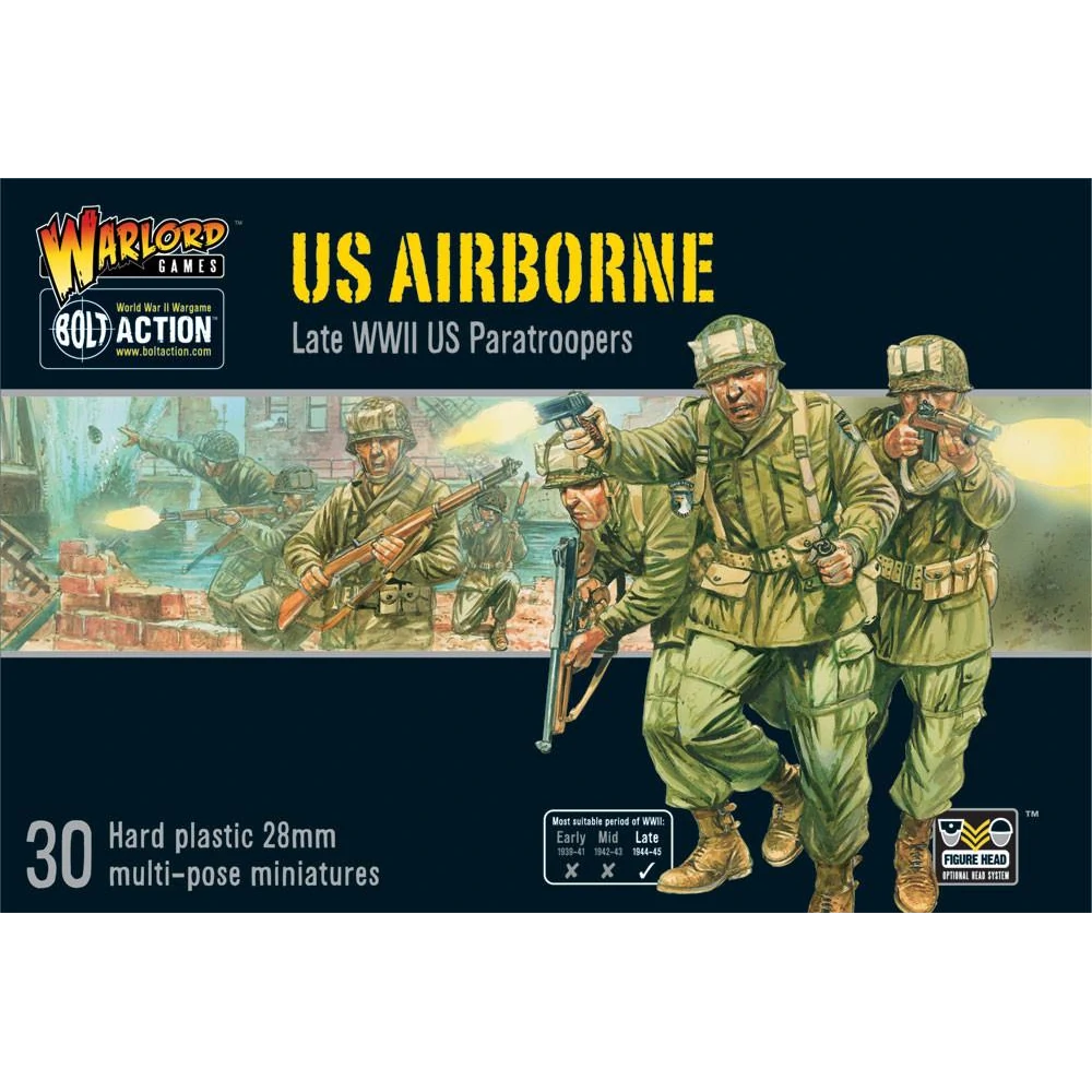 This awesome plastic US Airborne Late WWII Paratroopers platoon contains enough plastic components to make 30 US Airborne miniatures in M-1943 uniforms, plus a host of options to allow for different weapon configurations and command models.